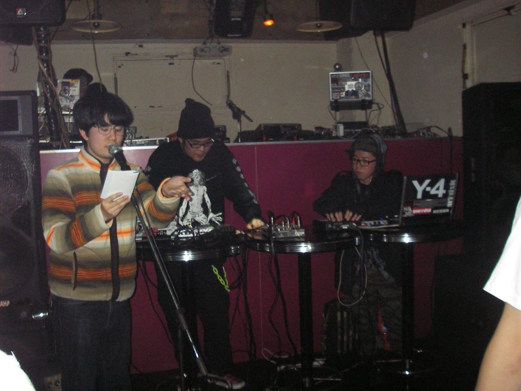 USKとは、テクノ部の活動として「LENSFLOOR」というテクノユニットを組んでいたので、もともと一緒に何かをやるという感覚があったのだと思います。このときは、USKがシンセを演奏している横で、自分はMPCで手打ちでキックを鳴らしていました。リズムは全然合っていなかったし、テクノを人力でやるのは無理がありましたね。そのあと、自分たちが作ったナードコアをかけるB2Bスタイル的な方向になっていきました。